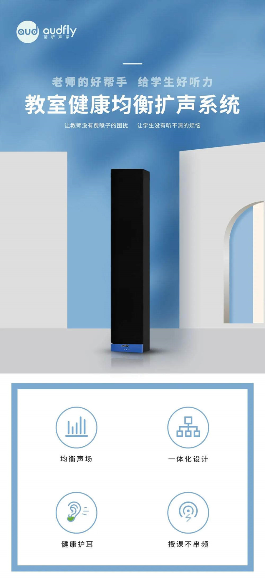 清聽(tīng)聲學(xué)教學(xué)均衡健康擴(kuò)聲系統(tǒng),是業(yè)內(nèi)首個(gè)“五合一”一體化、專業(yè)級(jí)教室擴(kuò)聲設(shè)備,通過(guò)均衡健康的聲場(chǎng)設(shè)計(jì),達(dá)到優(yōu)于美國(guó)標(biāo)準(zhǔn)的均衡指標(biāo),實(shí)現(xiàn)授課聲音的均勻傳播,呵護(hù)青少兒聽(tīng)力健康。設(shè)備一體化設(shè)計(jì),減少空間占用,提升安裝和使用便捷性、簡(jiǎn)易性。
